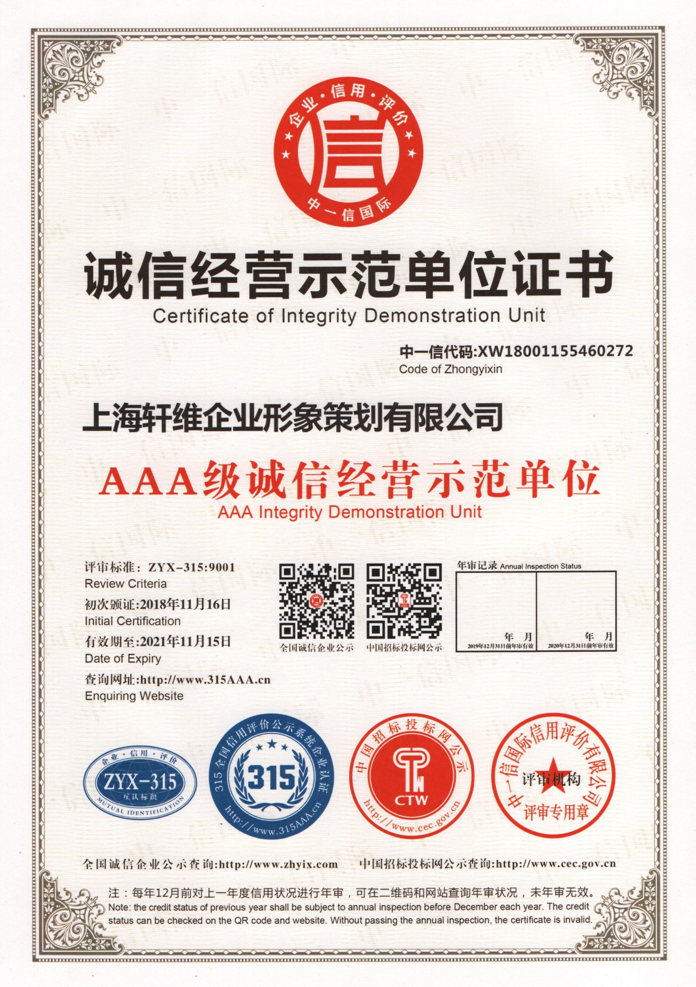 3A信用等級證書